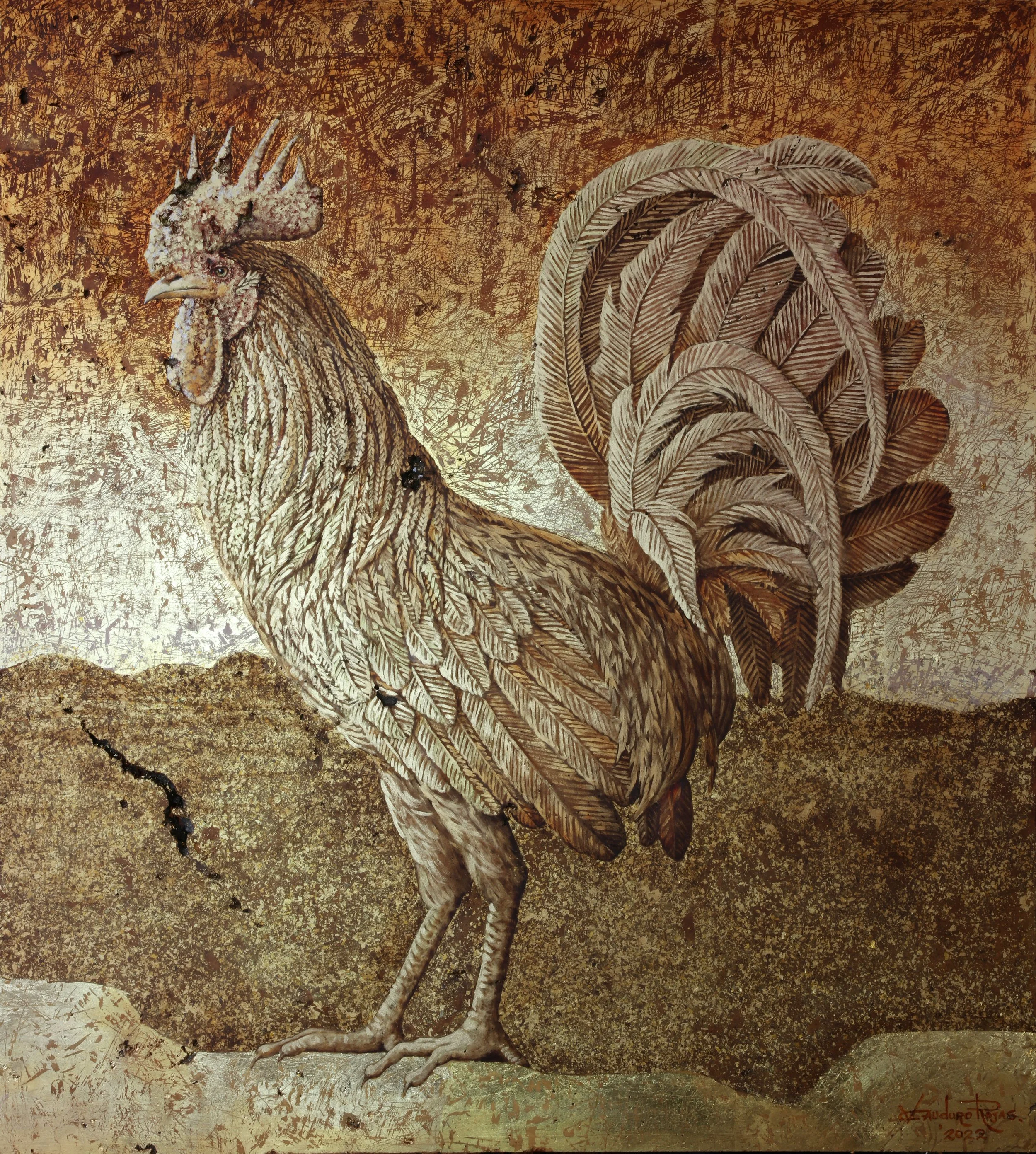 Óleo, oro de hoja, polvo de bronce sobre travertino