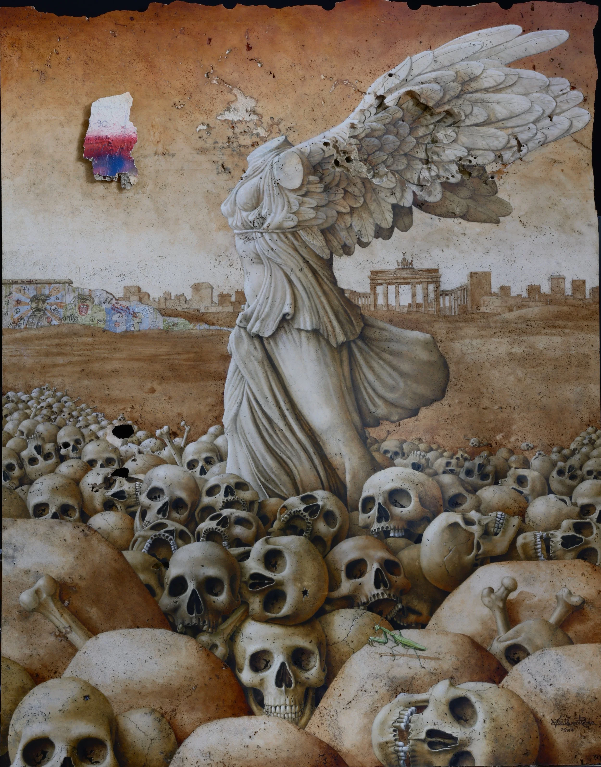 Óleo con fragmento del muro de Berlin sobre travertino rojo